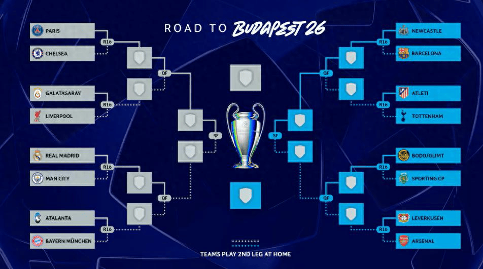 具体对阵也狠。皇马对曼城,胜者八强战打拜仁对亚特兰大的胜者。另一条线,巴黎对切尔西,胜者打利物浦对加拉塔萨雷的胜者。